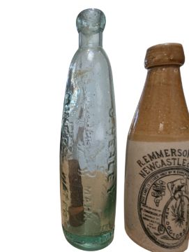 Five late 19th / early 20th century stoneware and glass advertising bottles. Comprised of a Bewick Brothers Double Stout bottle with stopper, R. Emmerson. Junior The Doctors Stout bottle, W Corry & Co Ltd, Belfast bottle, a Patterson's SS Camp Coffee & Chicory glass bottle, and a J. Healey mineral water bottle. Glass bottles with a green tint. Largest measuring approx. 23cm tall.