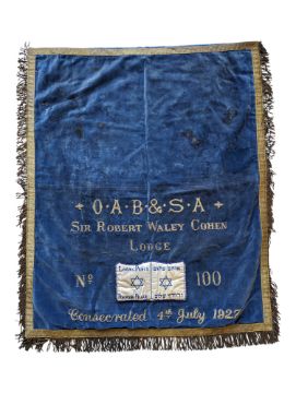 An early 20th century Jewish Torah mantel created to mark the inauguration of the Sir Robert Waley Cohen Lodge on 4 July 1927, in Southampton. The mantle is associated with Lodge No. 100 of the Order Achei Brith (O.A.B.) and the Shield of Abraham (S.A.), both abbreviations prominently embroidered at the top.