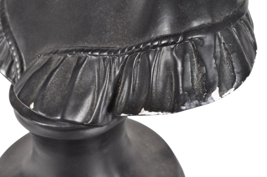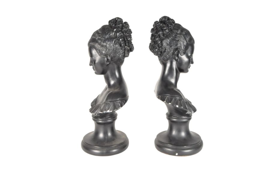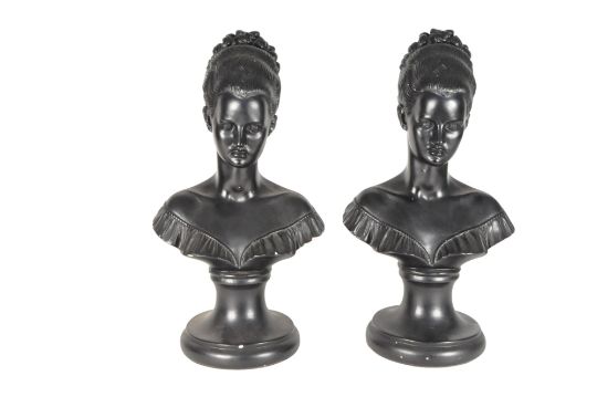 A pair of 20th century black chalkware female busts. The busts are crafted with detailed facial features, hair, and clothing, with a glossy black finish. Each bust is mounted on a rounded plinth base.