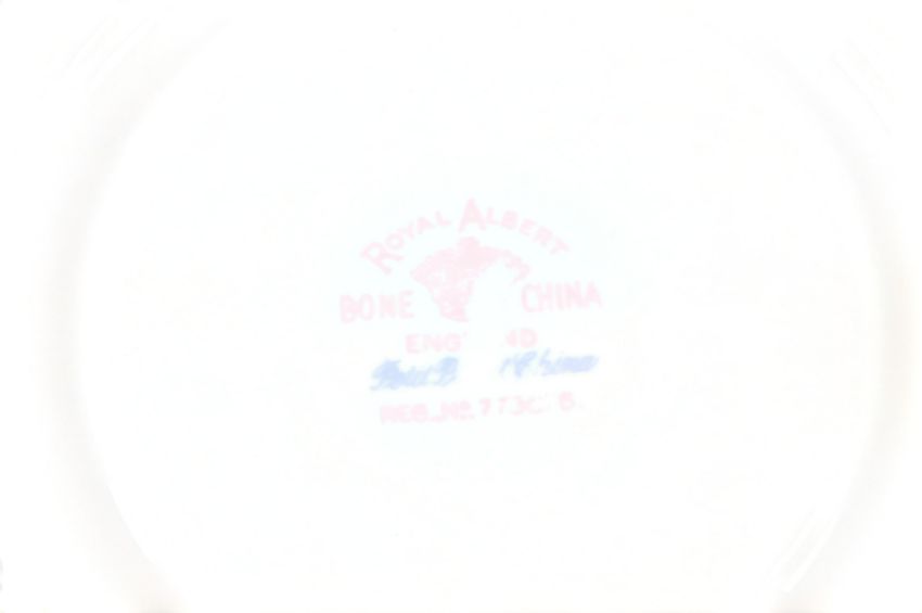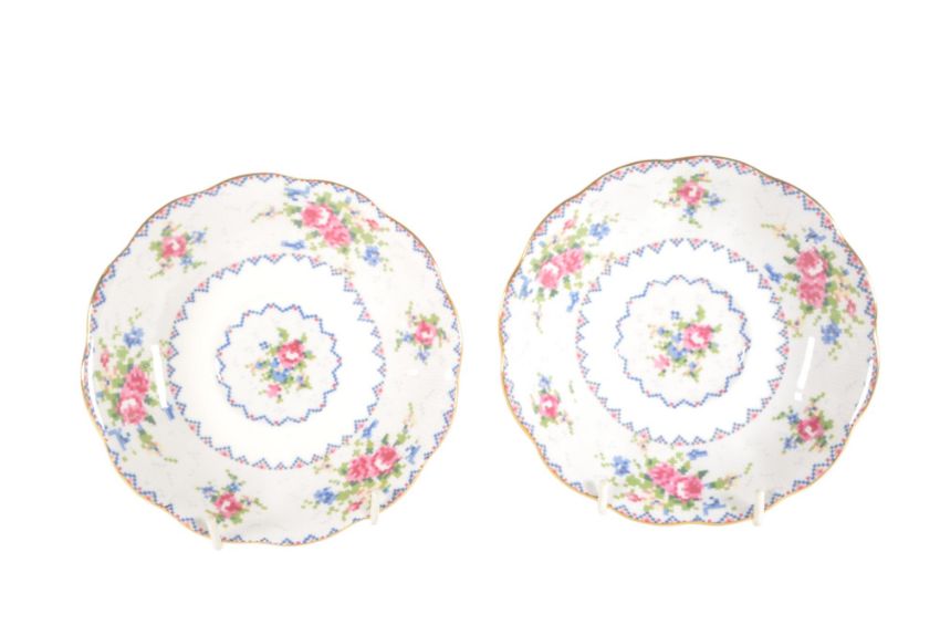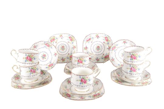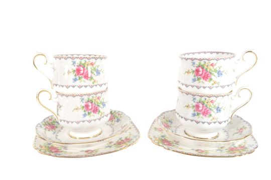 Royal Albert - 20th century bone china part tea service in the Petit Point pattern. Comprised of tea cups, saucers and plates. Featuring a pink, blue, and green cross-stitch design on a white ground. Registration number 778676. Maker's mark to the base of each piece.