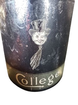 1920s Livens & Co College Toffee Tin money box in the form of a Top Hat. Decorated to the front with a hat band, displaying the College branding. Maker's mark to the underside. (AF) Missing coin slot. Dimensions: 15cm x 11cm