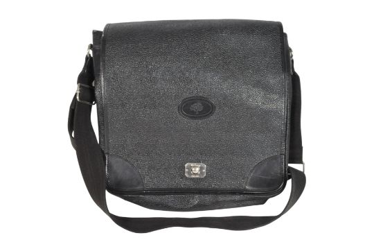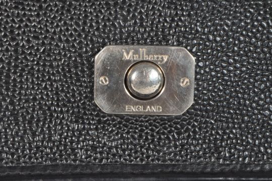 Mulberry - Late 20th / 21st century black pebbled leather shoulder satchel bag. Featuring a pebbled texture design with black webbing polyester adjustable strap, branded metal clasp, and polychrome plaid fabric lined interior. Housed within the original Mulberry branded burgundy drawstring bag. Measuring approx. 33cm x 33cm x 8cm.