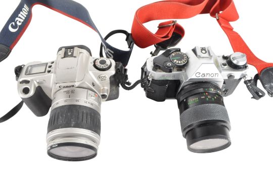 Canon - Two vintage 20th century Canon 35mm SLR cameras and lenses. The collection to include a Canon EOS 300 AF 35mm SLR camera body, alongside a Canon AE-1 Program 35mm SLR body. Also including a Canon 28-90mm F4-5.6 lens, a Vivitar 35-70mm F3.5-4.8 lens, and a Canon EF 75-300mm F4-5.6 lens.