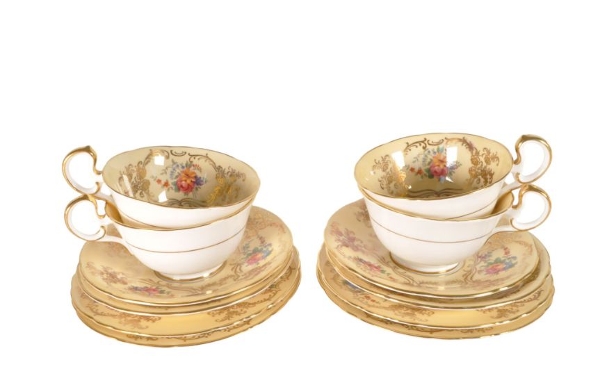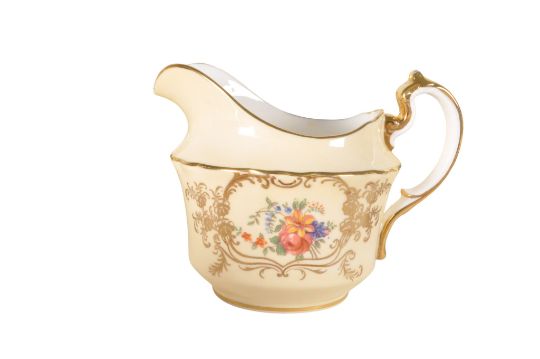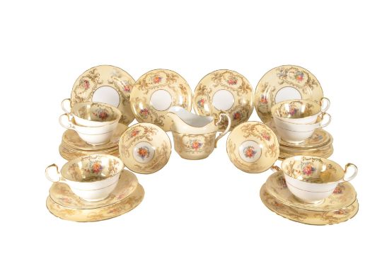 Aynsley - Mid century bone china part tea service in a floral transfer design on a cream ground with gilt detailing. Comprised of tea cups, saucers, milk jug, and small plates. Maker's mark to the bases.