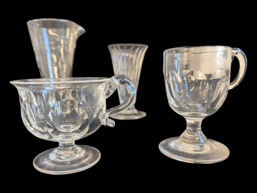 Collection of 18th / 19th century Georgian and Victorian glassware. Comprised of four custard cups, three of which with a cut design and another example with a geometric etched design, three jelly glasses and a measuring cup with etched measurements. Jelly glasses including a facet cut, half wrythen, and a full wrythen example. Largest measuring approx. 13cm tall. Sold as seen.