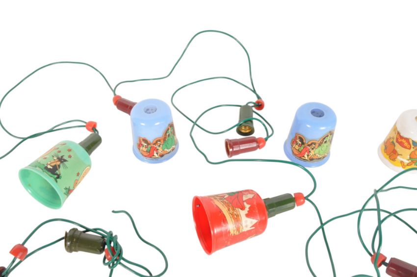 MAZDA - Vintage 1960s Disney Christmas decoration lights. Featuring bell shaped shades decorated with different Disney fairytale scenes. Unboxed.