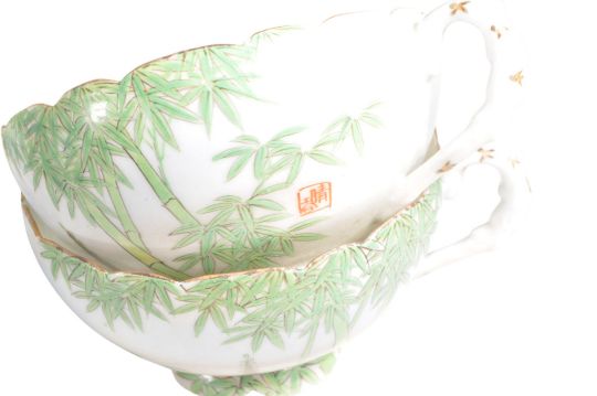 Large early 20th century Japanese Noritake egg shell tea service in a hand painted bamboo pattern on a pale blue ground. Comprised of a teapot, tea cups, coffee cups, saucers, small plates, large plates, milk jug, bowls, and more. All with a maker's mark to the underside. Sold as seen.