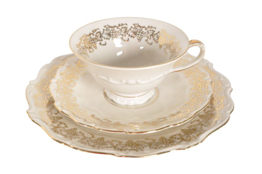 Collection of 20th century vintage china tea cups, saucers, and plates. Comprised of makers such as Bavaria Schirnding, Royal Grafton, Lawleys, Spode, Hammersley & Co, Foley, Denton, Coalport and Havfland & Co. All with the maker's mark to the base.