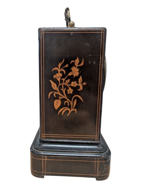French early 20th century carriage style mantel clock. Features a glazed and brass clock face with enscribed Roman numeral chapter ring and brass moulded handle atop. Clock housed within a wooden case featuring inlaid foliate decoration, all raised on a plinth style base. Measuring approx. 23cm x 17cm x 13cm.