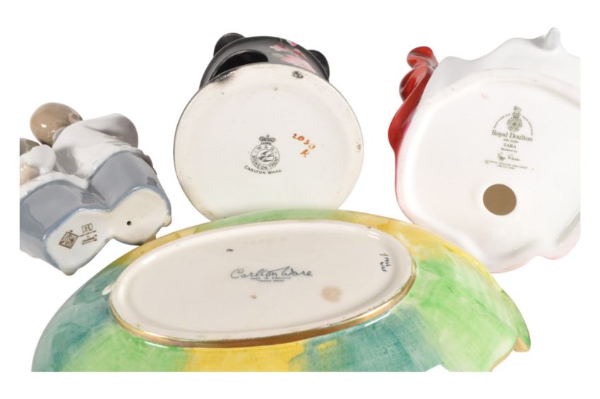 A collection of vintage 20th cenutury porcelain figurines. Including Carltonware tea light holder, lustre Art Deco dish, Royal Doulton Sara figure HN2265 modelled by Poppy Davies and Lladro Nao figure of two choirboys.