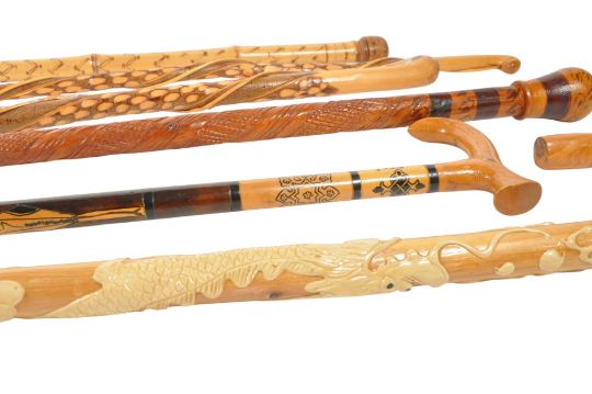 A collection of six vintage 20th century carved wood walking sticks / canes / staffs. Some examples featuring dragon figures, carved bark designs, ebonised banding and inlaid decorations. With shepherd's hook handle and knobs.