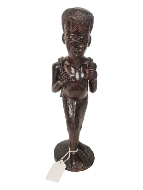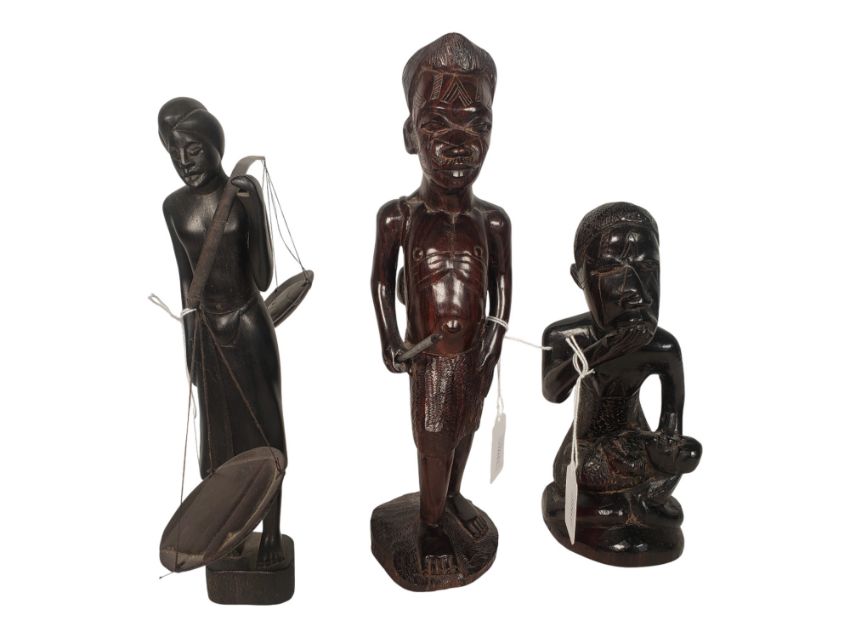 A collection of seven hand carved wooden figures. Mid century African folk or tourist art. Hand carved from dark wood with polished finish, each represents a stylised human and bust. In various poses and symbolic roles. 29cm height approx.