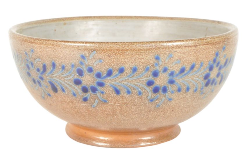 Stock - A vintage mid 20th century Stock Portuguese stoneware fruit bowl. The bowl of rounded form with salt glazed exterior featuring blue glazed floral motif detail in the manner of Juggtown Pottery / Ben Owen. Marked ' Stock Made in Portugal ' to base.