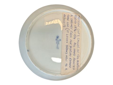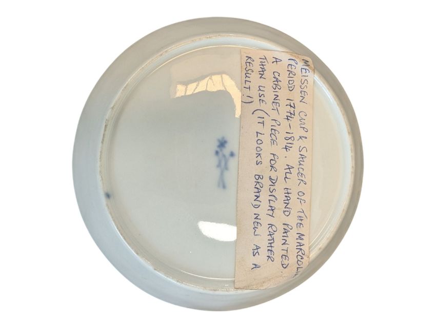 Late 18th / 19th century Meissen Marcolini period china coffee cup and saucer. Cup featuring a serpetine shaped handle and raised on three claw feet. Cup and saucer both with floral decoration in a mauve and gilt colourway. Meissen crossed swords makers mark to the bases. Cup measures approx. 7.5cm x 9cm x 6.5cm.