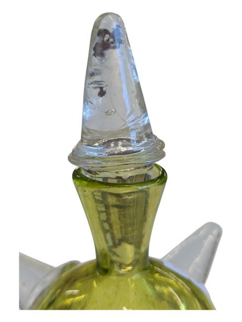 A vintage mid 20th century studio art glass atomic star decanter. Having a globular green glass body with tapering points / stands with clear bubble control stopper.