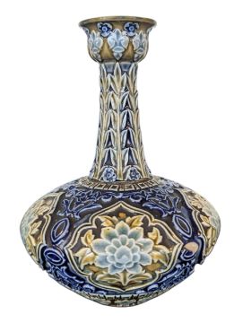 Pair of late 19th century Doulton Lambeth signed stoneware vases. Featuring a bulbous base with tapering neck and moulded relief floral decoration in a blue and green colourway. Maker's mark to the bases. Measuring approx. 13cm x 9.5cm x 9.5cm.