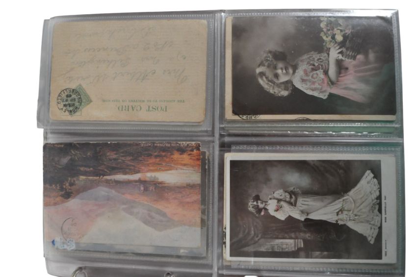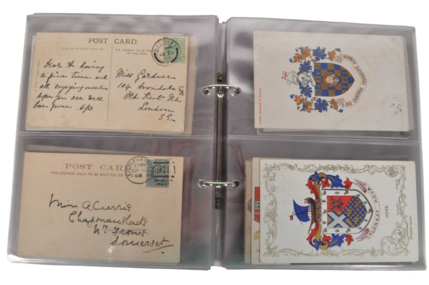 Collection of 20th century vintage British postcards. Comprised of topographical, greeting cards, real photographs, portraits, coat of arms, and illustrations. Featuring locations such as Birmingham, Brighton, Bath, Winchester, Liverpool, London, Portland, Swanage, Glastonbury, and more. Housed within three albums.