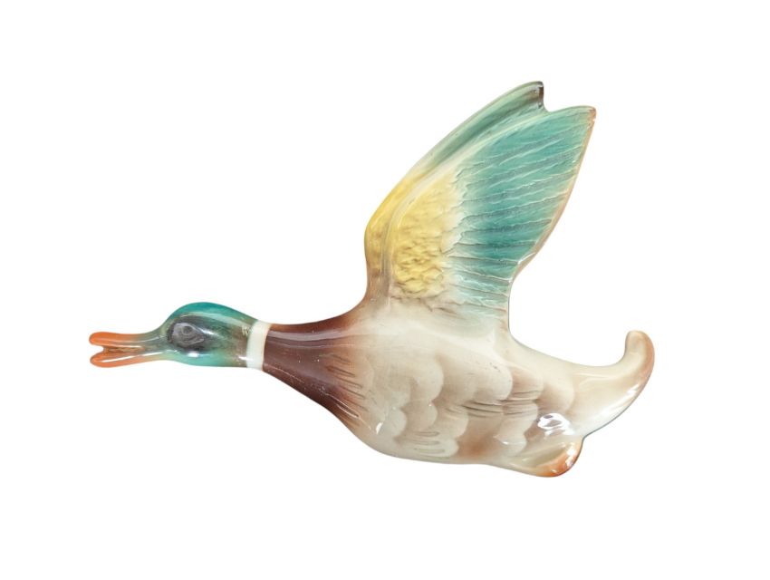 Keele Street Pottery - Three 1970s vintage Staffordshire earthenware graduating wall hanging flying duck figures. In a green, brown, and yellow colourway. Manner of Beswick. Maker's mark on the reverse of each piece. Largest piece measuring approx. 13cm x 18.5cm x 2.5cm.