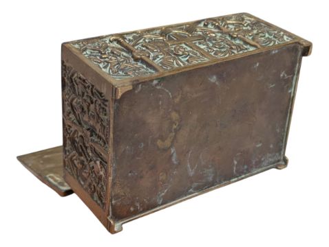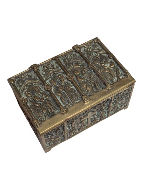 A 19th century heavy brass ecclesiastical trinket / jewellery casket box. Having crucifix to front and centre, with decorated panels of figures and church decor. Hinged lid with a wooden interior and shaped feet.