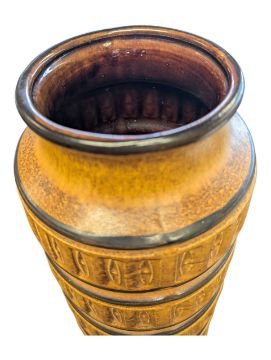 A vintage mid century Scheurich Keramik West German pottery vase. Numbered 268-40 to the underside. Of cylindrical form with moulded geometric bands / patterns in a brown colourway. Measuring approx. 40cm x 15cm.