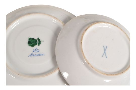A collection of 19th century Victorian and later porcelain china figurines / items. Including Dresden, Augustus Rex, German figurine, bachelor's tea set, Miessen cup and saucer, KPM Berlin item any may more examples.