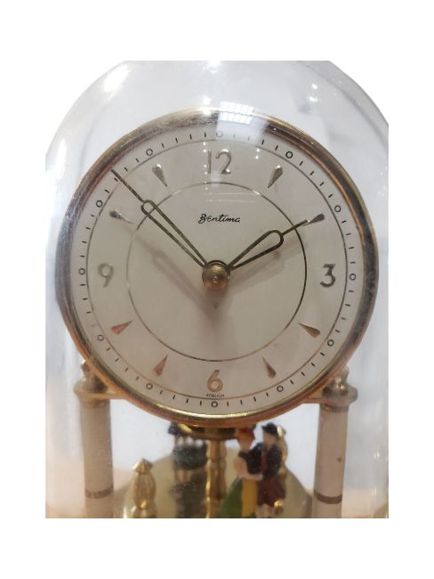 Two mid 20th century vintage anniversary clocks. Comprised of a Bentima mantel anniversary clock with circular metal base and brass rotating mechanism with dome, and a West German Quartz D.B.P. battery operated President anniversary clock with Roman numeral chapter ring. Measuring approx. 16.5cm x 12.5cm x 12.5cm.