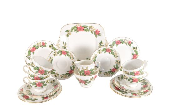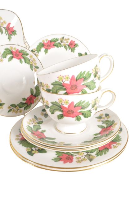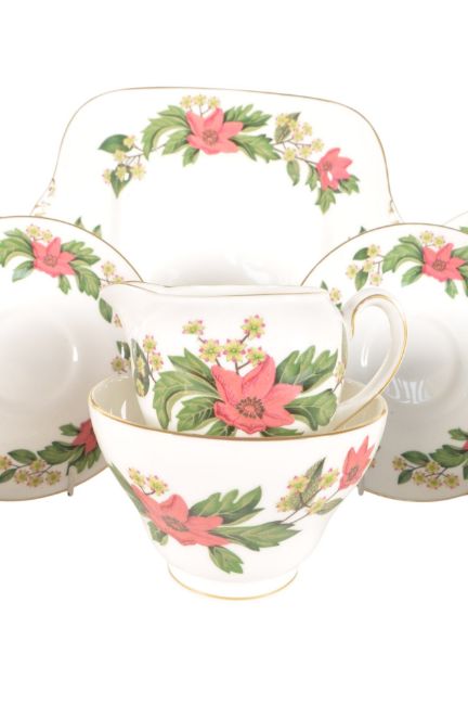 Wedgwood - A 20th century vintage bone china tea service in the Starflower pattern. Comprised of tea cups, saucers, plates, milk jug, sugar pot, and serving plate. Maker's mark to the base.
