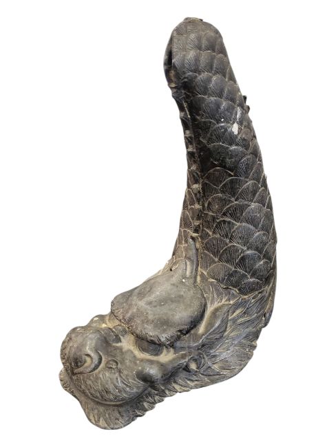 A 20th century cast iron boot scraper in the form of a sausage dog / Dachshund and a spelter pond spitter in the form of a dragon. Boot scraper painted in a matte dark grey. Largest piece measures approx: 36cm in length.