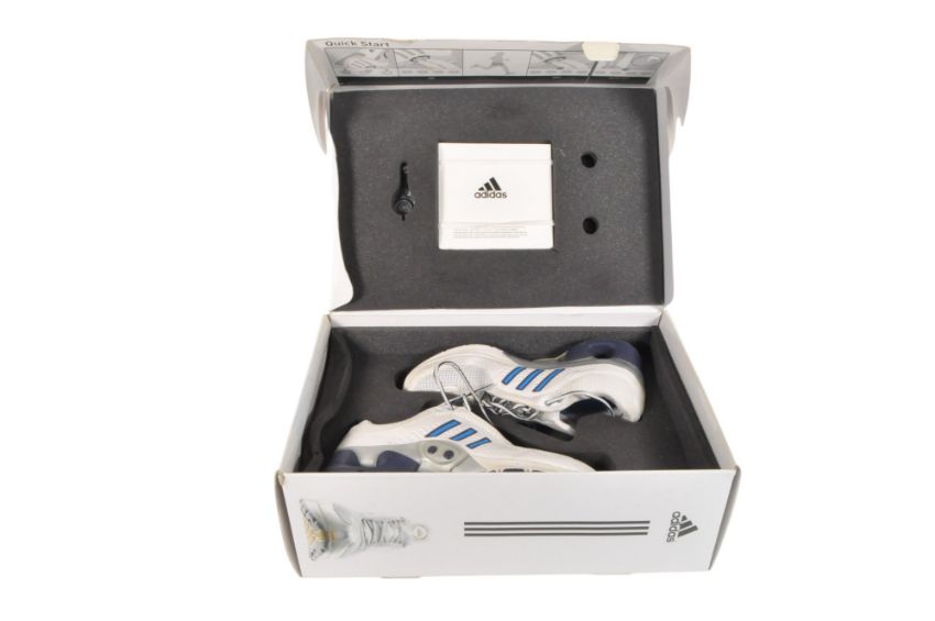 A pair of unused and boxed 2005 adidas_1 Intelligent trainers, size UK 8. The shoe in white colourway with blue three stripes branding. With original box.