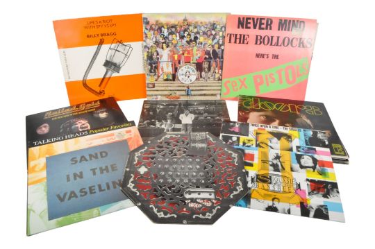 A collection of vintage 20th century rock and punk vinyl lp records. The collection featuring examples including Ian Dury - New Boots and Panties SEEZ 4A/4B, The The - Infected EPC 26770, Greenslade - K46259, Cocteau Twins - The Spangle Maker BAD 405, New Order - Blue Monday FAC 73, Horslip - Happy to Meet, Sorry to Part MOO 3, Sex Pistols - Never Mind the Bollocks BSK 3147, alongside other examples by Billy Bragg, Dire Straights, and others.