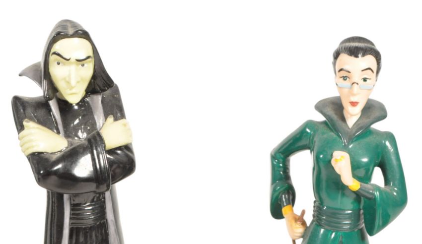 A collection of Royal Doulton Harry Potter series figurines. To include Hermione Studies for Potions Class, Ron Follows the Weasley Family Tradition, Ron and Scabbers, Professor McGonagall, Professor Severus Snape, Slytherin or Gryffindor.