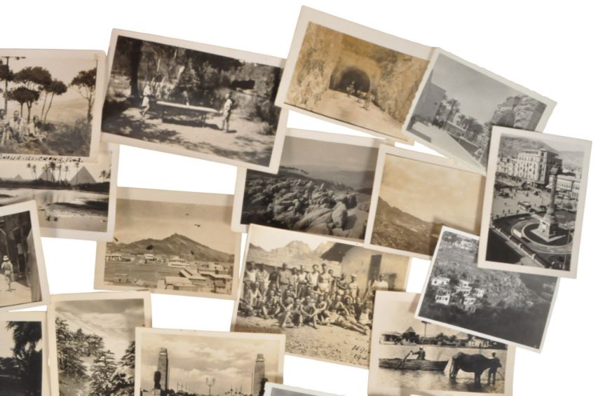 A circa 1940s photograph album containing images from the Middle East. The photo album containing photographs taken during the 1940s - likely by a British RAF / Military person - depicting largely architecture and street scenes, with images taken in Palestine, Egypt, Syria, Libya, Yemen, and Lebanon. Alongside a small selection of loose images. Album AF