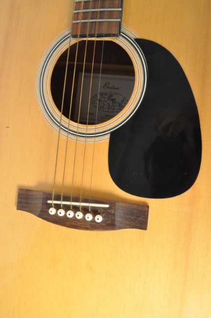 Two vintage late 20th century six string acoustic guitars. Comprised of a Boston model BN200N guitar and an Egmond Freres guitar serial no. 21900020. Both housed within a soft carry case. Largest measuring approx. 105cm in length.