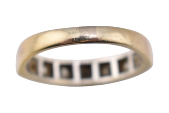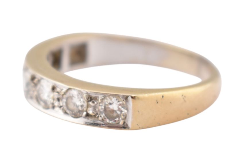An 18ct gold and diamond half hoop ring. The ring set with seven round brilliant cut diamonds. Estimated total diamond weight 1cts. Stamped 18ct. Weight 5.3g. Size R.5