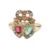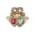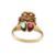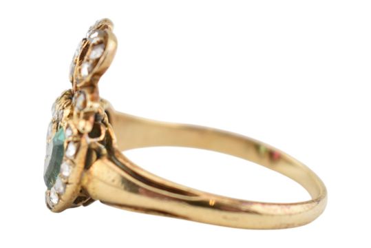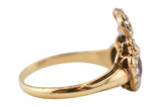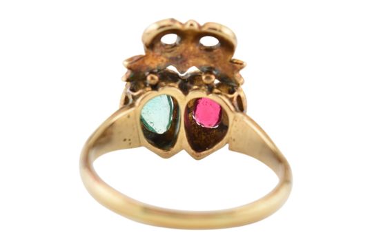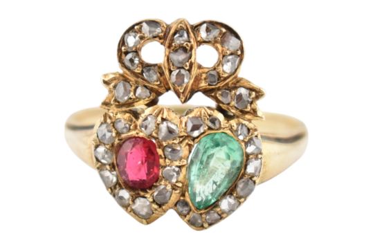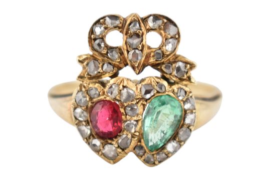 A Victorian 18ct emerald paste and diamond twin heart ring. The ring with interlocking hearts set with a pear shaped emerald and a replacement round cut red paste stone, framed by rose cut diamonds, and surmounted by a diamond-set ribbon bow. The ring unmarked tests indicate 18ct gold. Total weight 5.8g. Size R.