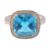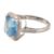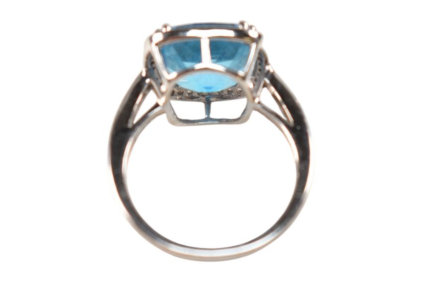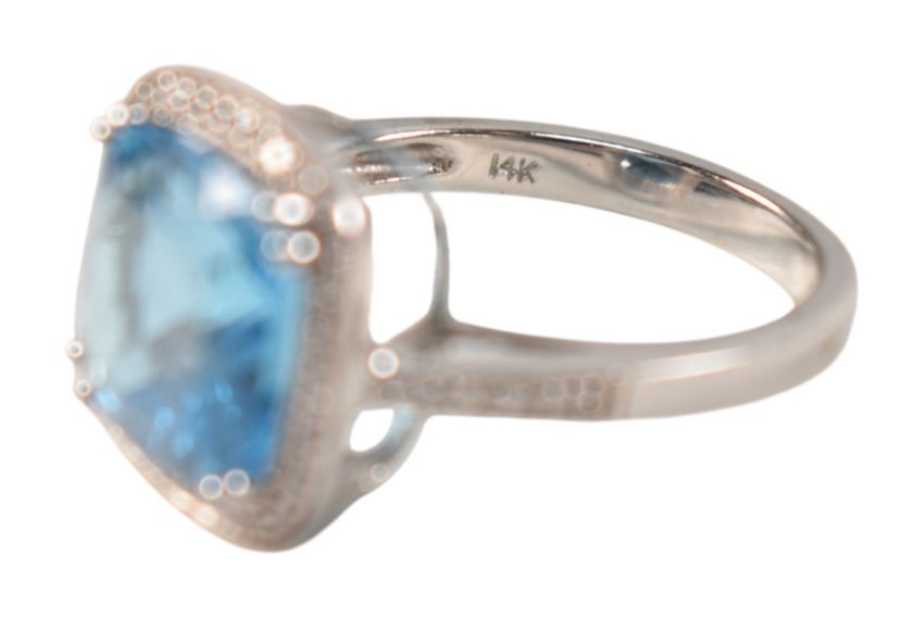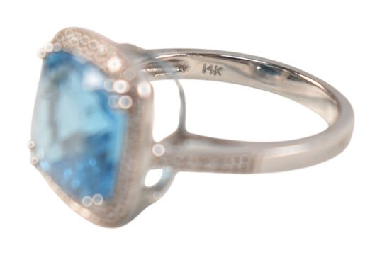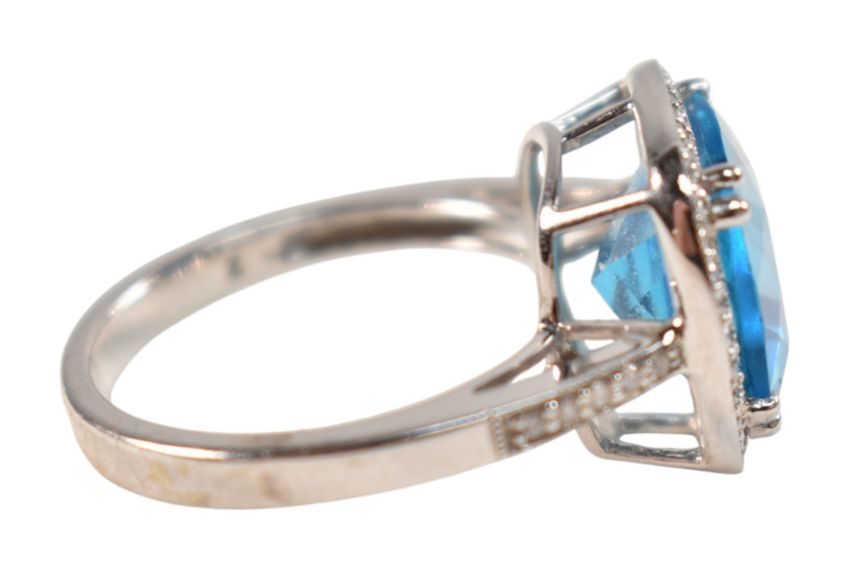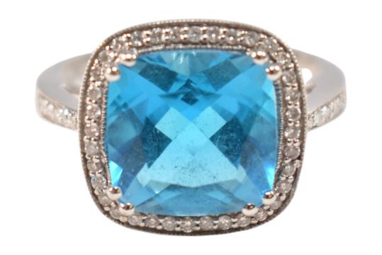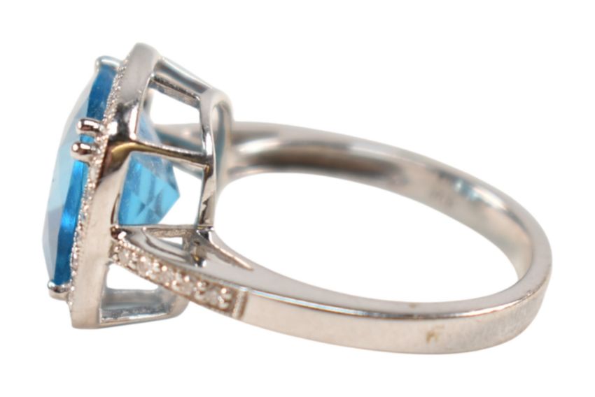 A 14ct white gold blue topaz and diamond halo ring. Stamped 14K. Weight 4.6g. Size M.
