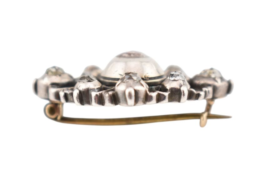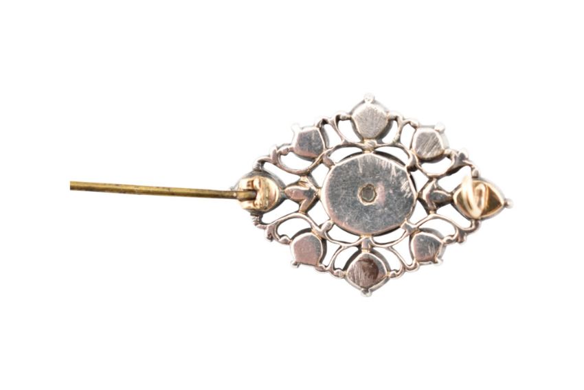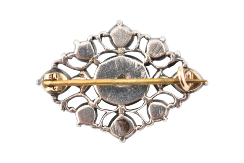 A 19th century white metal and diamond brooch pin. The brooch having collet set rose cut diamonds to an openwork mount having hinged pin and c-clasp verso. Weight 7.7g. Measures