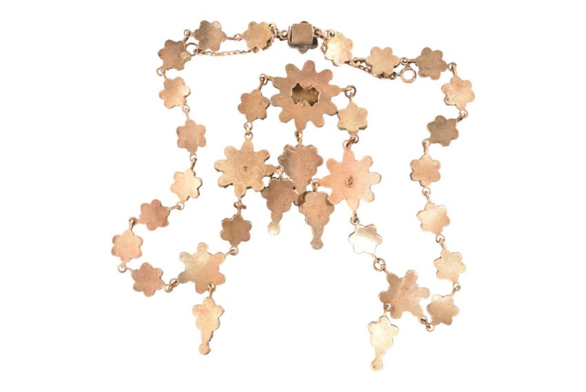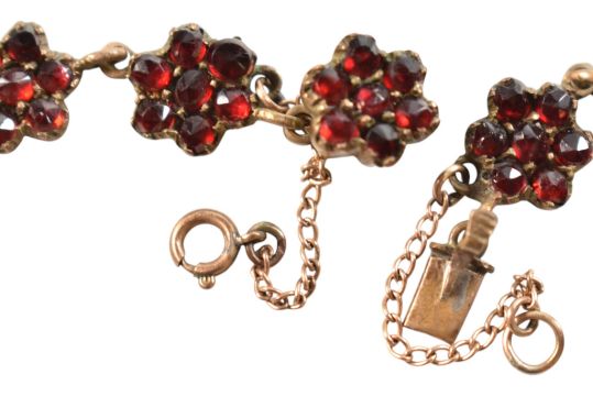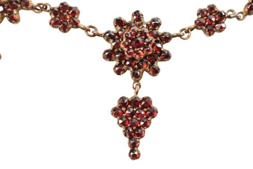 An antique Bohemian garnet floral cluster fringe necklace. The necklace with multiple garnet clusters and drops having a box clasp. Measures 43cm. Unmarked.