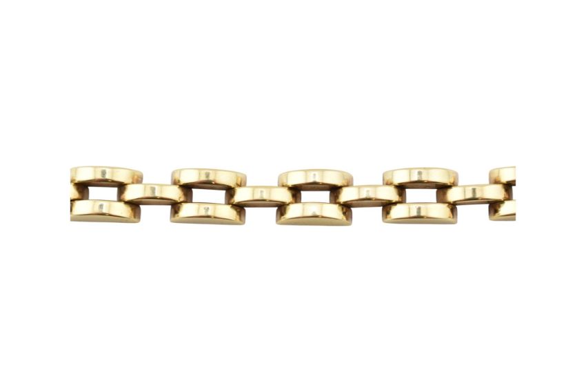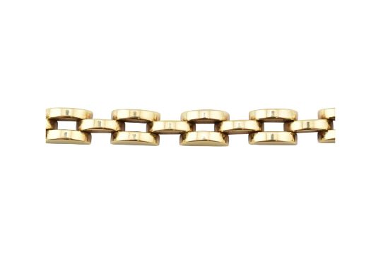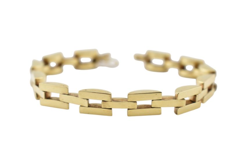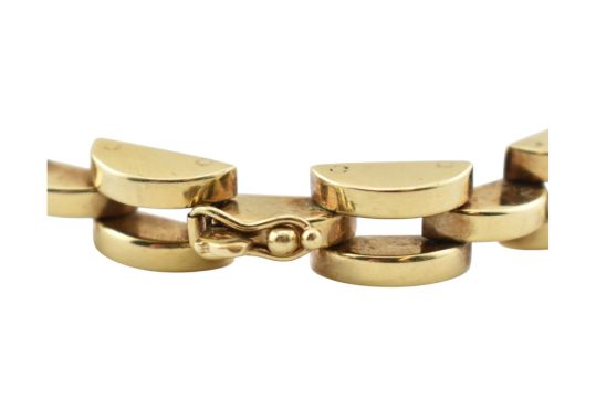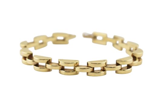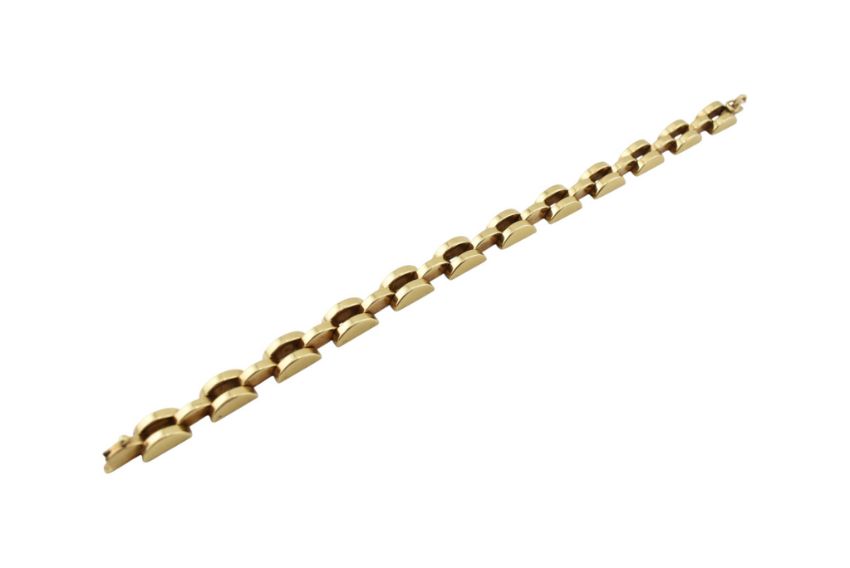 A retro 14ct gold tank bracelet. The bracelet is formed with semi-circular links to a concealed clasp with a safety catch. Czech swan mark to clasp 585. Weight 16.9g. Measures 18.5cm x 8mm.