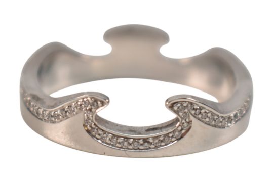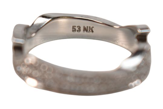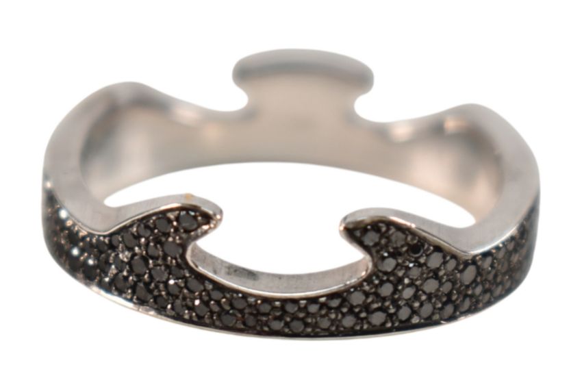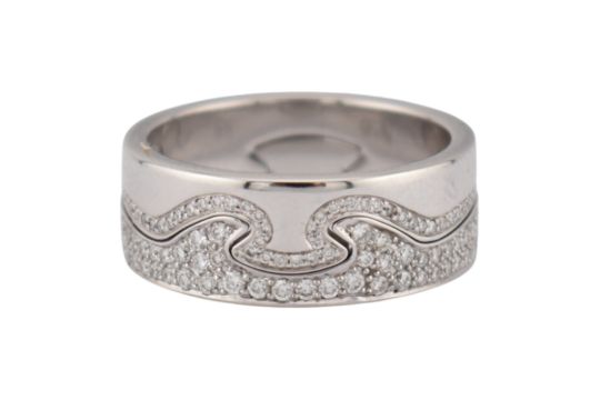 Georg Jensen - 18ct gold and diamond Fusion ring set from an original design by Nina Koppel. Three interlocking bands are interchangeable in twos with black and white diamonds. All with the oval dotted Georg Jensen mark, 750, Denmark, 53 NK. Size N. Weight 11.5g. With Georg Jensen ring box. Original receipt and International warranty card.N.5