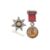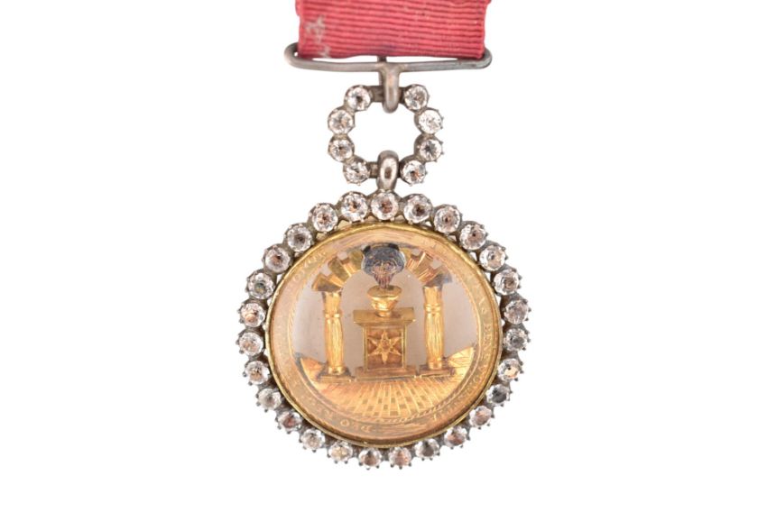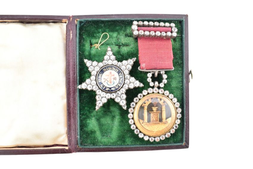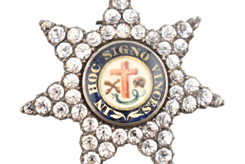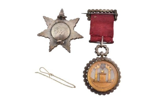 Templar Freemasonry: A brooch and medal jewel. A 'Knights Templar' paste-set and enamel seven-pointed paste set star brooch, the centre with a glazed and enamelled roundel displaying a red Latin cross with a skull and crossed bones to either side and 'IN HOC SIGNO VINCES' to a black border. Together with another Knights Templar example medal having notation and altar, framed with paste to the outer rim and bale strung on on ribbon.