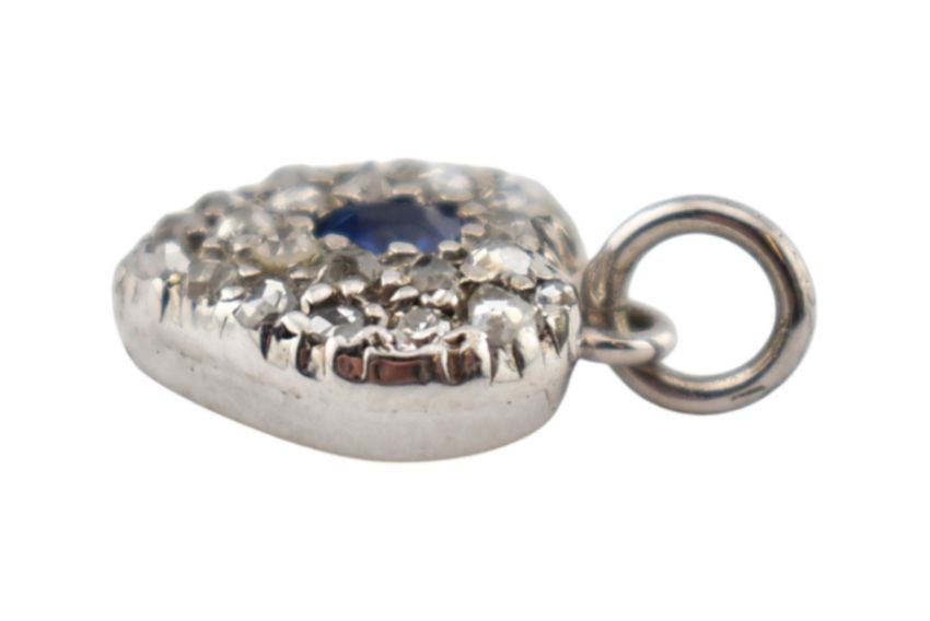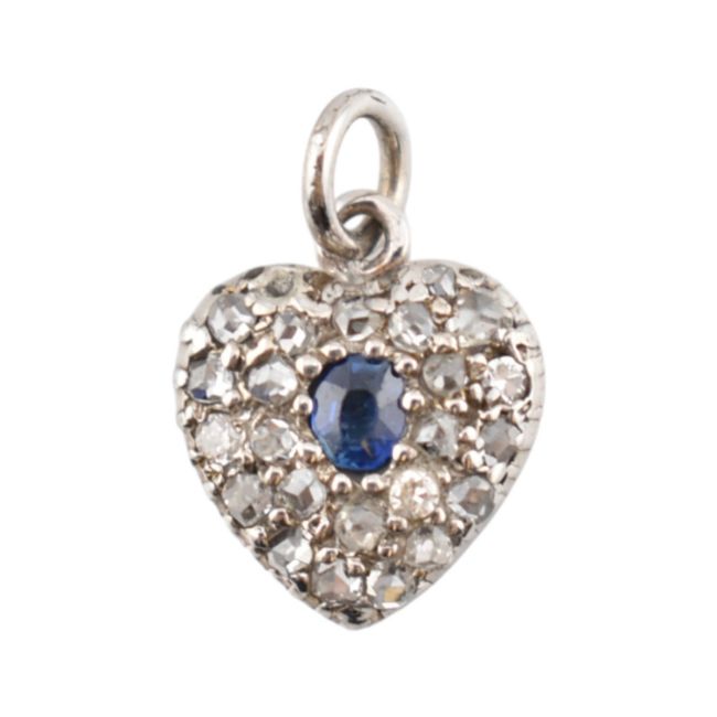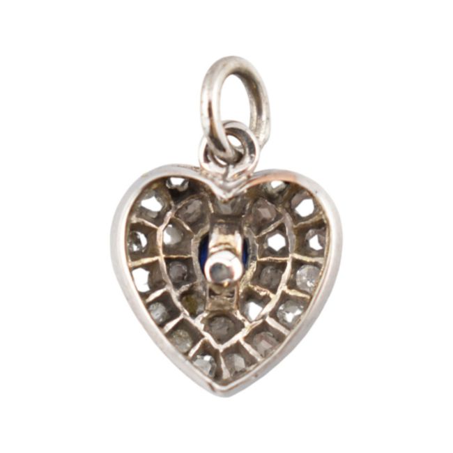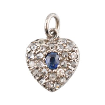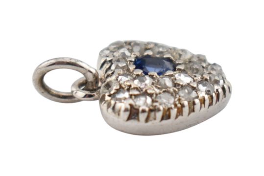 A sapphire and diamond heart pendant. The pendant set with a central oval cut sapphire framed by pave set rose cut diamonds. Measures 1.5cm including bail. Weight 1.1g.