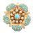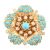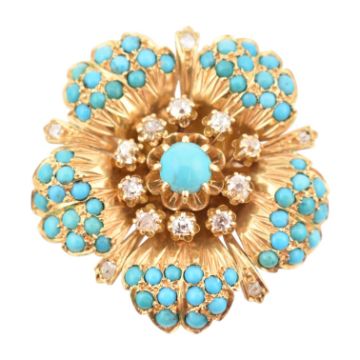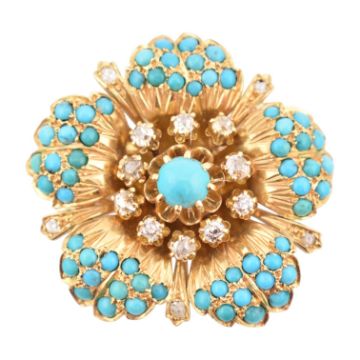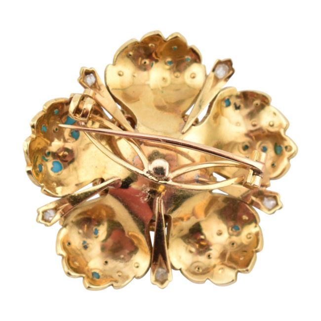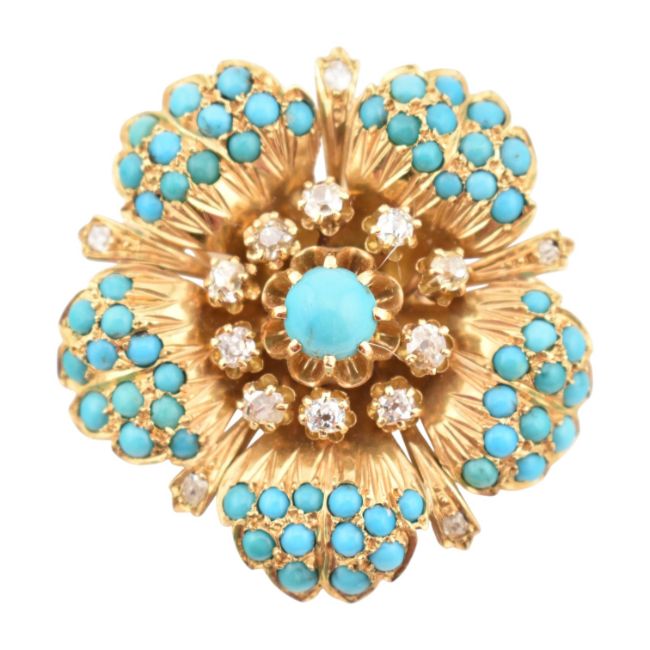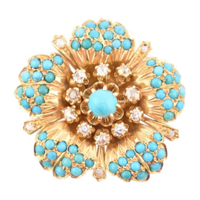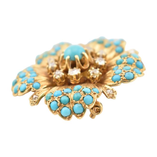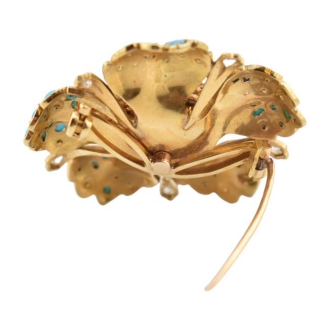 From the collection of 'Bond Girl' Valerie Leon. A 1950s continental 18ct gold diamond and turquoise brooch. The brooch in the form of a flower with textured, stylised petals set with turquoise cabochons and old cut diamonds. French Owl mark to pin. Total weight 20.5g. Estimated diamond weight 0.60ct.