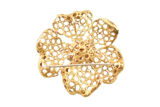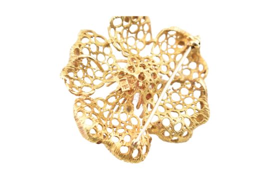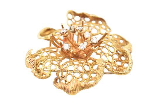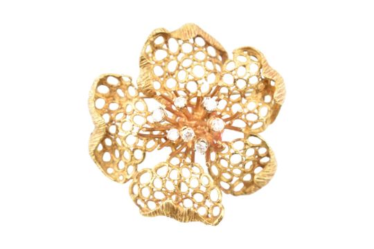A 1970s hallmarked 18ct gold and diamond flower brooch pin. The brooch pendant in openwork design with diamond-tipped stamen having roller clasp pin and pendant bail verso. Marked CJ ld 750 with import hallmark for London 1971. Total weight 14.2g. Measures 4.5cm.