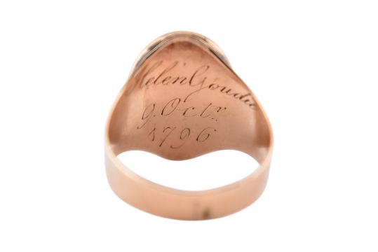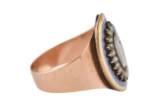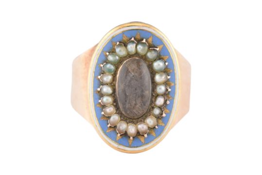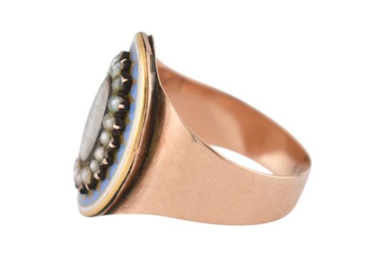 A 19th century gold, enamel and pearl hair locket mourning ring. Unmarked, tests indicate gold. Weight 4.3g. Size M.5