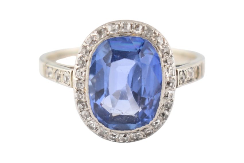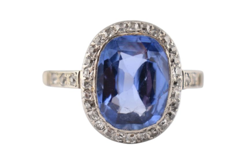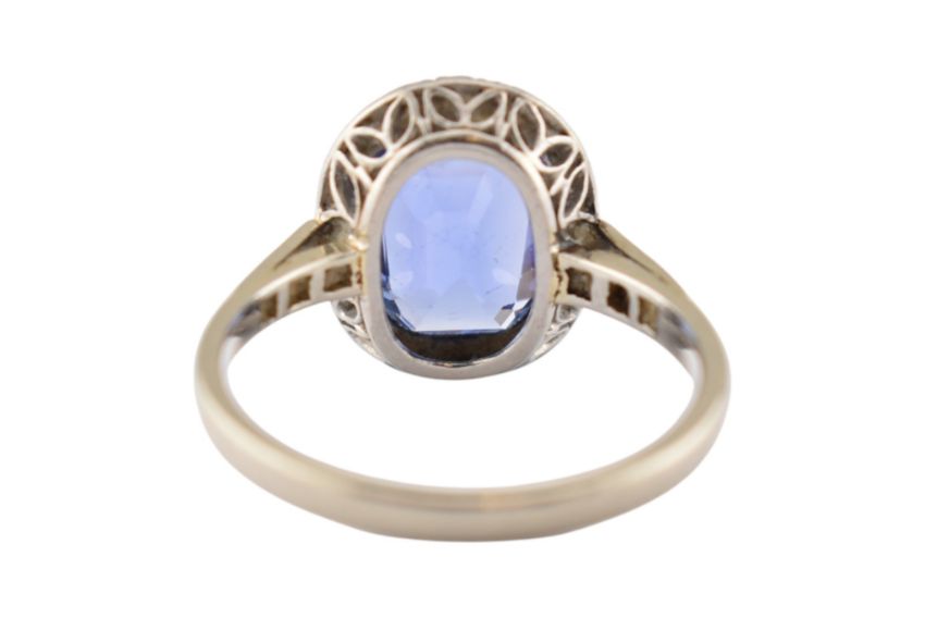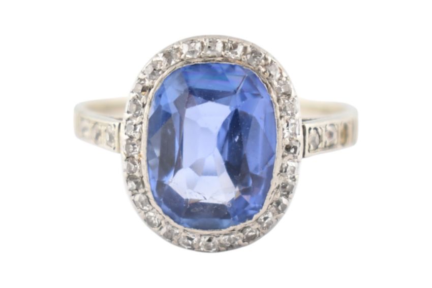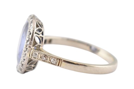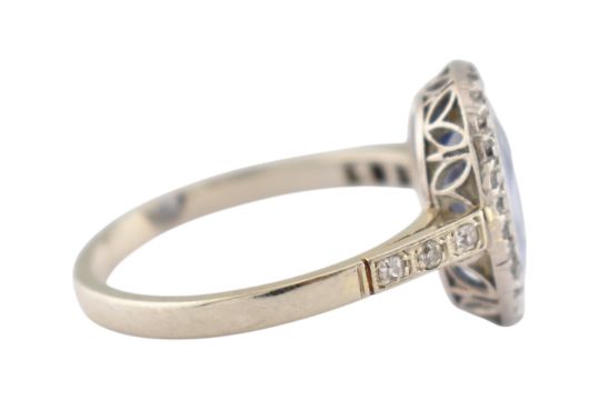 An early 20th-century sapphire & diamond halo ring. The ring set with a central oval-cut sapphire 10.2mm x 8mm x4.3mm framed by single-cut diamonds to a pierced gallery and diamond set shoulders (one diamond deficient). Total weight 3.6g. Size N. Unmarked tests indicate 14ct gold.