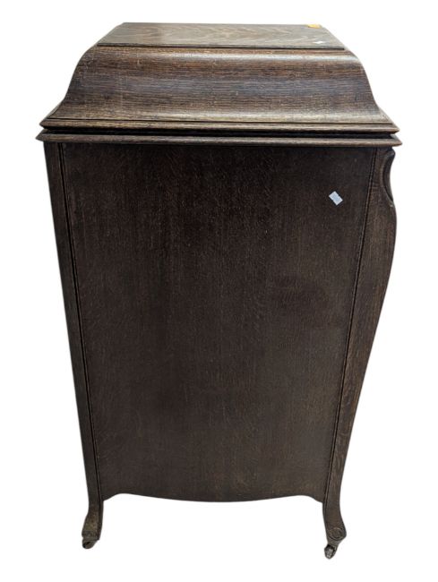 An early 20th Century, circa 1930s pak cased floor standing HMV Gramaphone. The cabinet raised on cabriole legs, cabinet doors to front for record storage, Side winder with HMV applied label to top, record deck within. Measures approx: 110x49x58cm