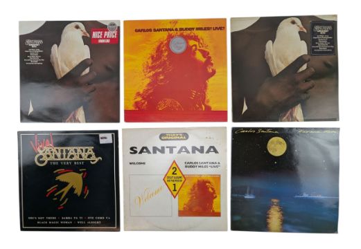 The lot includes Moonflower (CBS88272), Borboletta (CBS69084), Abraxas (32032), Santana Louis triple LP album with inserts (CBS66325), Love Devotion Surrender (CBS69037), Freedom promo copy (CBS450391-1), x2 Greatest Hits (CBS 32386), Santana & Buddy Miles Live (CBS32271), double album Welcome & Miles Live (TFOLP 14), Havanna Moon (CBS25350) & The Very Best (NE1338).