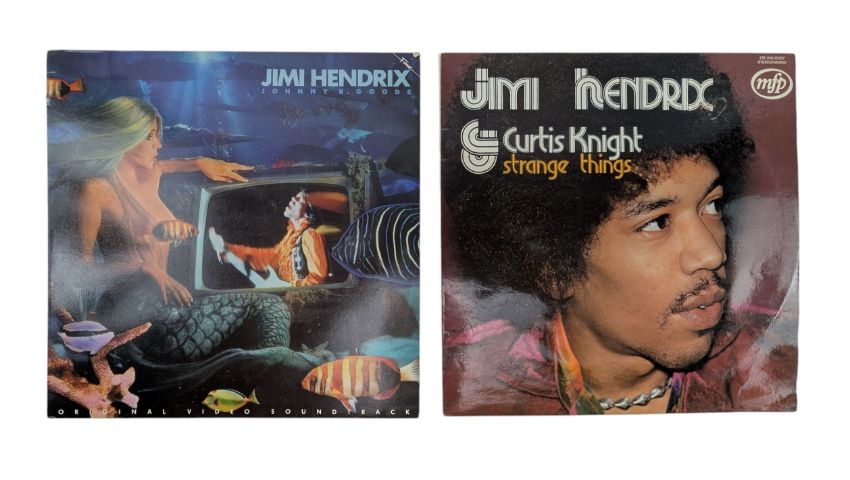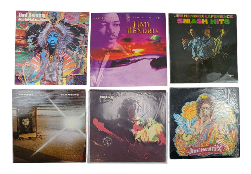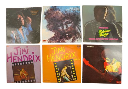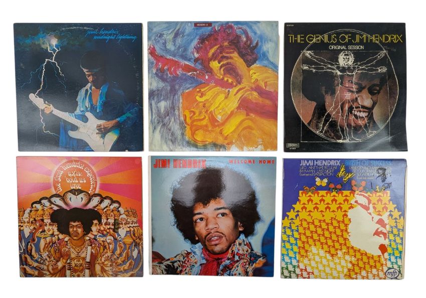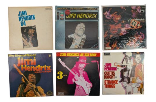 The lot includes Axis Out-Takes.... Volume 1 (PRLP038, no. 0647/3000), First Rays Of The New Rising Sun double LP album (MCA2-11599), Smash Hits (Track, 612004), Re-Experienced double LP album (Polydor, 2679036), Band Of Gypsys (Capitol, STAO-472), In The Beginning (SLP-502), Concerts double LP album (CBS88592), Midnight Lightning (0698), The Genius Of Jimi Hendrix Original Session (CV1331), Welcome Home (ASTAN 201020), Axis Bold As Love (SPELP3), Birth Of Success (MFP 500053), The Cry Of Love (SPELP98), In The West (MS2049), Rainbow Bridge (K44159) and many more.