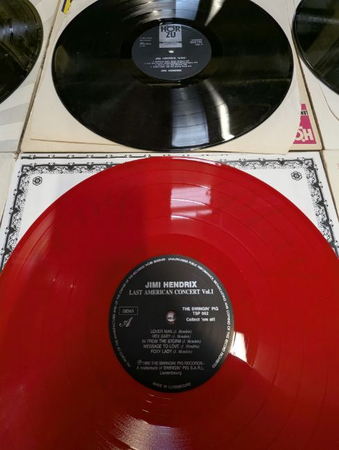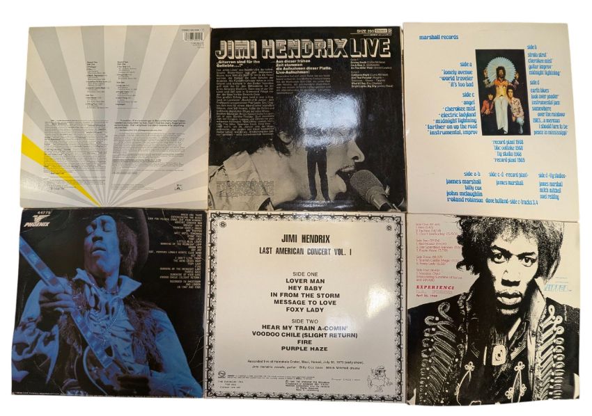 The lot includes Never Fade double LP recorded in Amsterdam & London 1967 / 1968 (Phoenix label, 44775), Last American Concert Vol. 1 recorded Haleakala Crater, Maui & Hawaii July 30th 1970 (The Swingin' Pig label, TSP 062, pressed in red vinyl), The Jimi Hendrix Experience Live At Winterland double LP album (Polydor label, 833 066-1, with poster), Birth Of Success (HOR ZU label, SHZE 293), Experience L.A. Forum April 26th, 1969 double LP (Zipper label, LA4M42669) & James Marshall Ladyland In Flames double LP (High Land Records label, J-1).